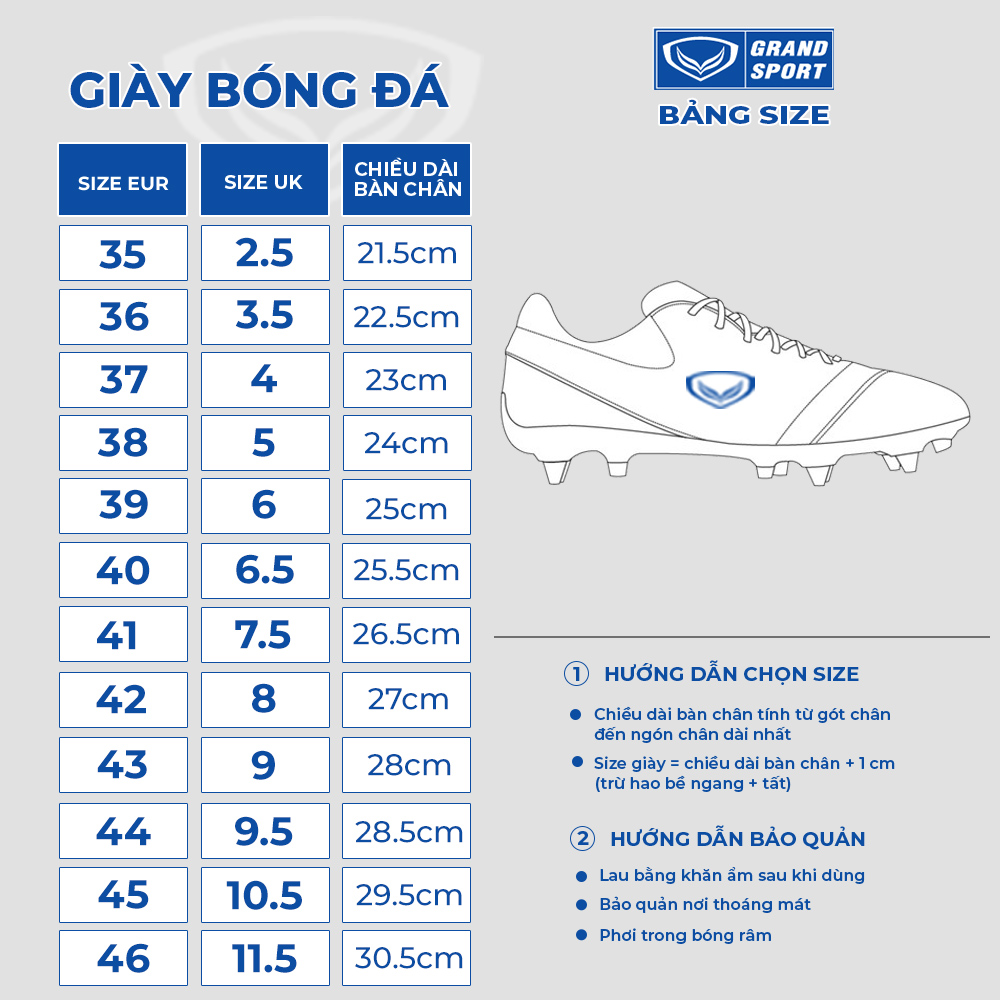HƯỚNG DẪN SỬ DỤNG BẢO QUẢN Giày Bóng Đá Turf Grand Sport 333099 Xanh Dương